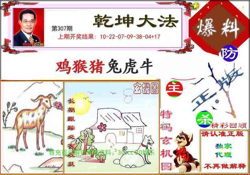 | 307期:七肖 | 龙狗羊鸡蛇牛猪 | 开:狗20 |